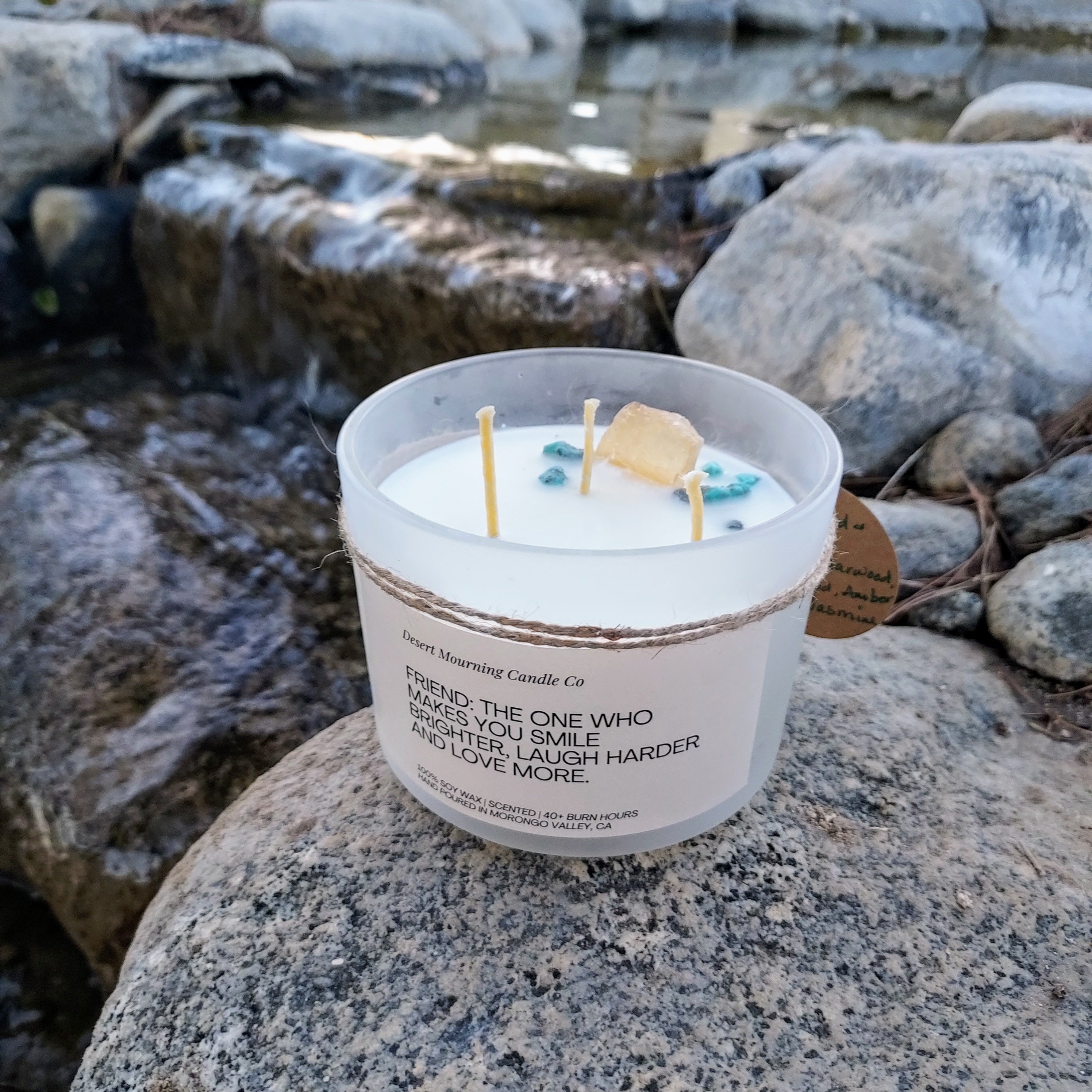 We are so happy to be able to make these candles for you. Our candles are 100% soy wax and hand poured in our home. You can burn your candle with the crystals in place; they may be removed to prevent sinking if your wax pool is deep. Our candles come with either a hemp wick or an eco-friendly wood wick. Crystals vary in size and color.